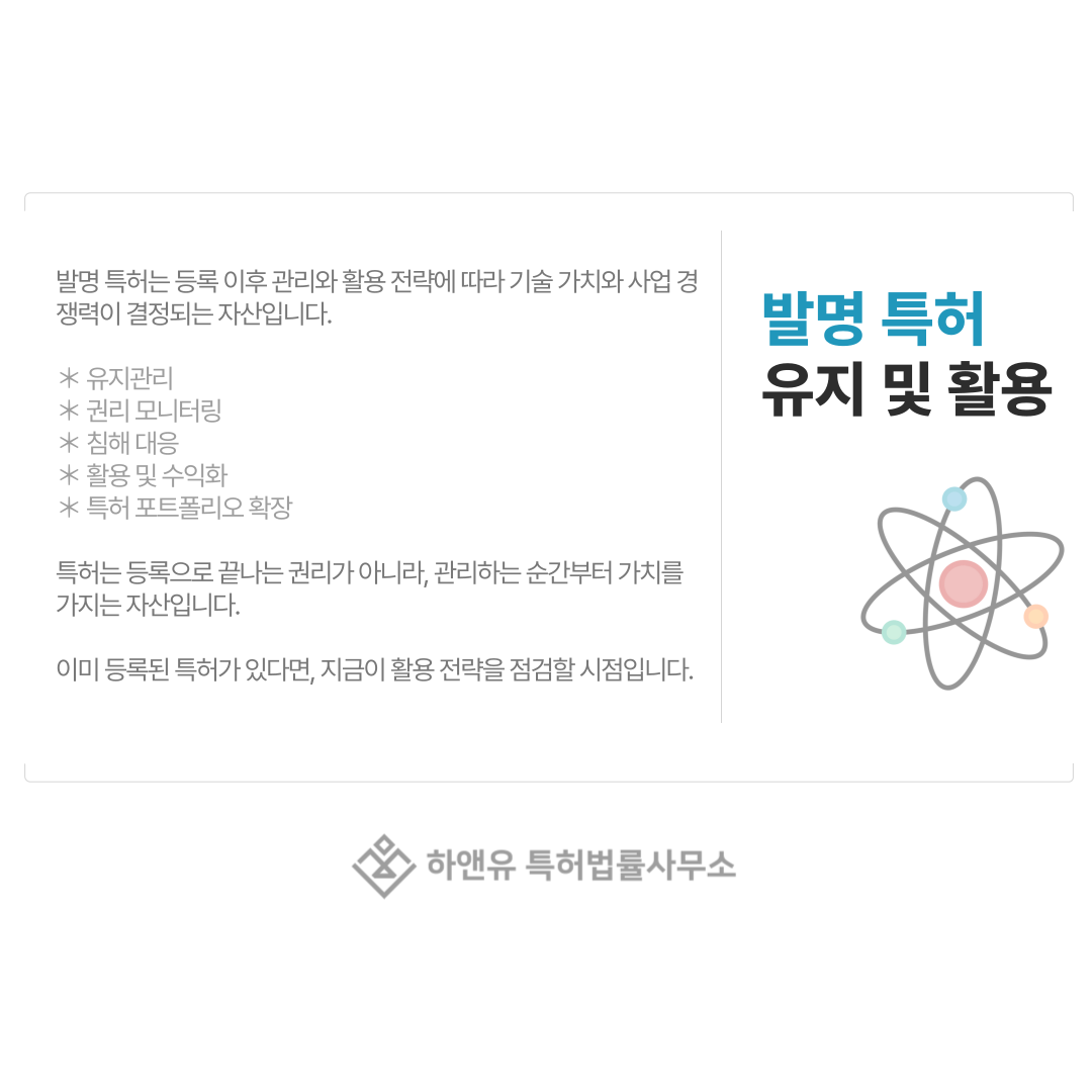 발명 특허는 등록 이후부터가 본격적인 활용 단계이며, 이 시점을 어떻게 관리하느냐에 따라 기술의 가치와 사업 경쟁력이 달라집니다.