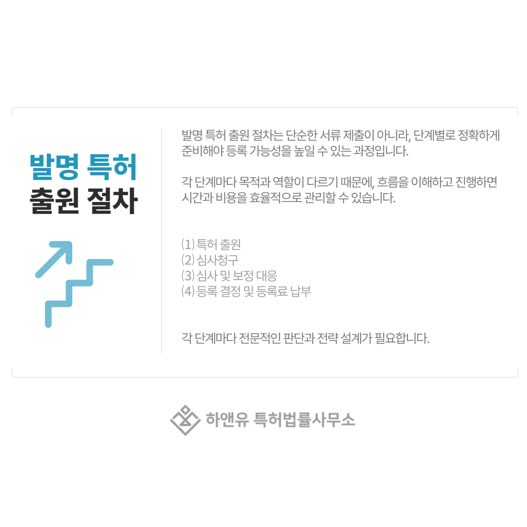 발명 특허 출원 절차는 단순한 서류 제출이 아니라, 단계별로 정확하게 준비해야 등록 가능성을 높일 수 있는 과정입니다.