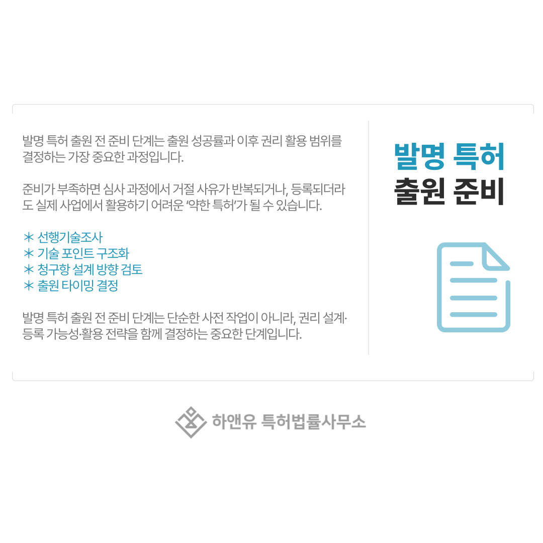 결론적으로, 발명 특허 출원 전 준비 단계는 단순한 사전 작업이 아니라, 권리 설계·등록 가능성·활용 전략을 함께 결정하는 중요한 단계입니다.
