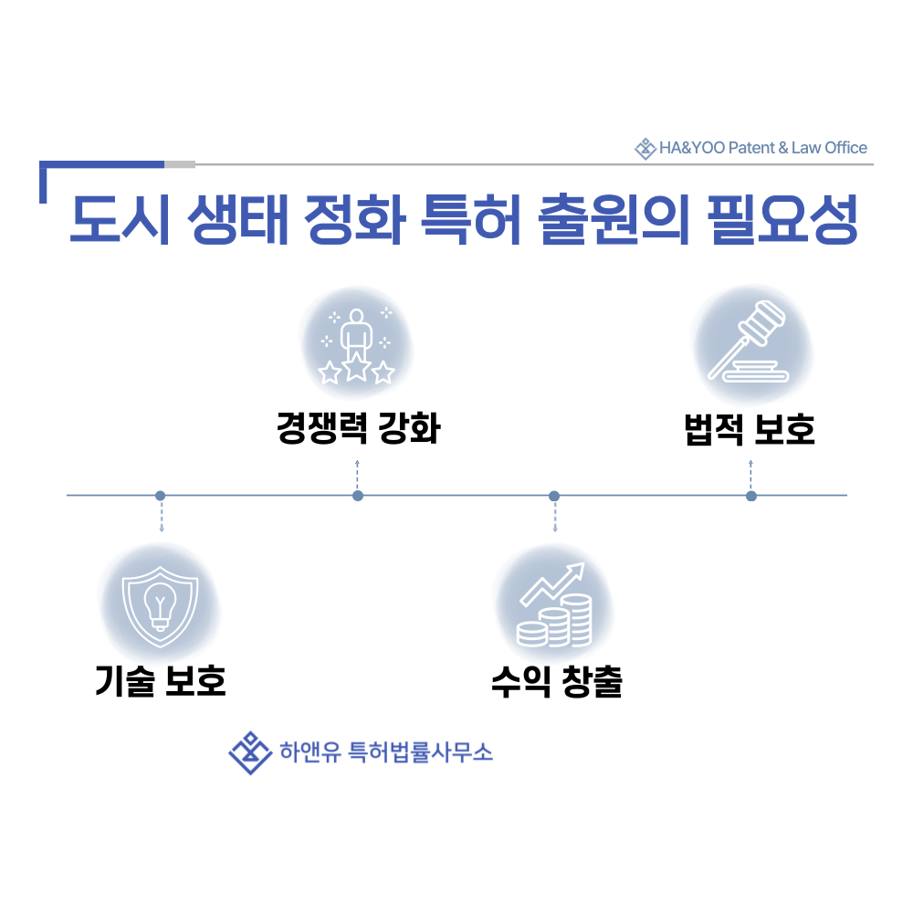 이처럼 도시생태계 복원·녹지조성·지반녹화 기술 특허 출원은 도시 환경 개선과 지속 가능한 생태계 회복을 가능하게 하는 기술적 차별성을 보호하고, 관련 산업 및 공공 인프라에서 활용 가치를 법적으로 확보할 수 있는 중요한 절차입니다.