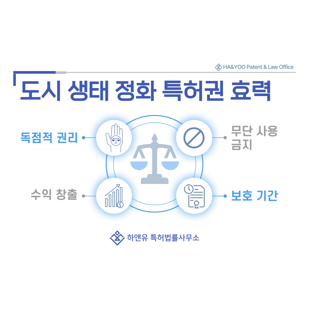 특허권을 통해 도시생태계 복원 및 녹지조성 기술은 법적 보호 장치를 확보하게 됩니다. 출원인이 허락하지 않은 타인의 사용을 제재할 수 있으며, 무단 활용 시 손해배상 청구 및 사용 금지 등의 법적 조치를 취할 수 있습니다. 이를 통해 연구개발 노력과 기술적 우위를 법적으로 안전하게 보장받을 수 있습니다.