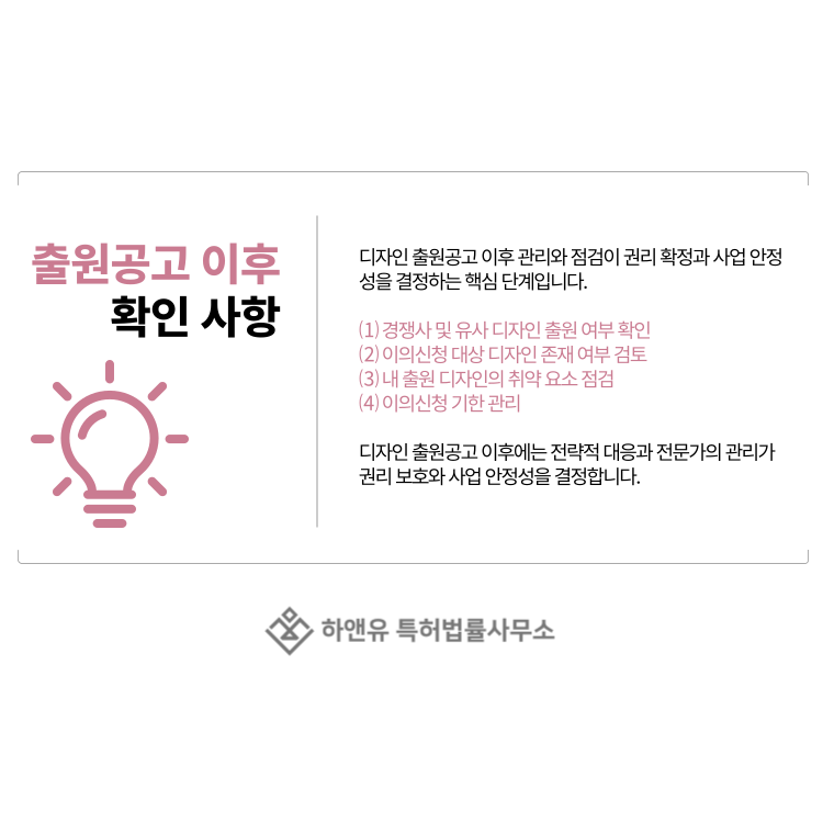 디자인 출원공고 이후의 핵심은 ‘지켜보는 것’이 아니라 ‘전략적으로 대응하는 것’입니다.