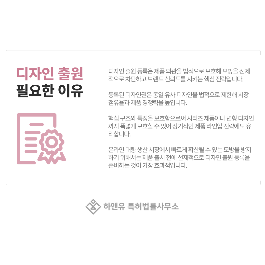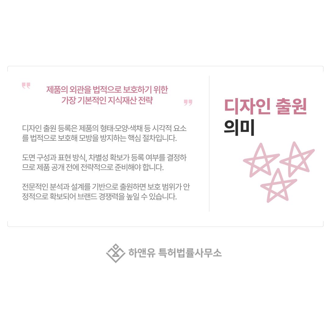 이처럼 디자인 출원 등록은 단순한 형식적 절차가 아니라 브랜드 가치와 시장 지위를 지키기 위한 필수 전략입니다.