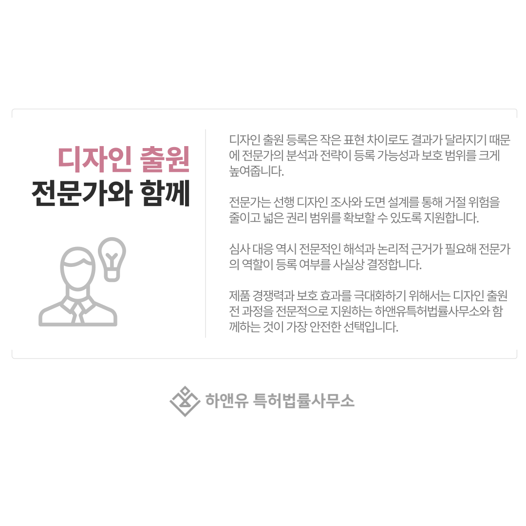 디자인 출원 등록을 전문가와 함께해야 하는 가장 큰 이유는 등록 가능성과 보호 범위를 높이기 위해서입니다.