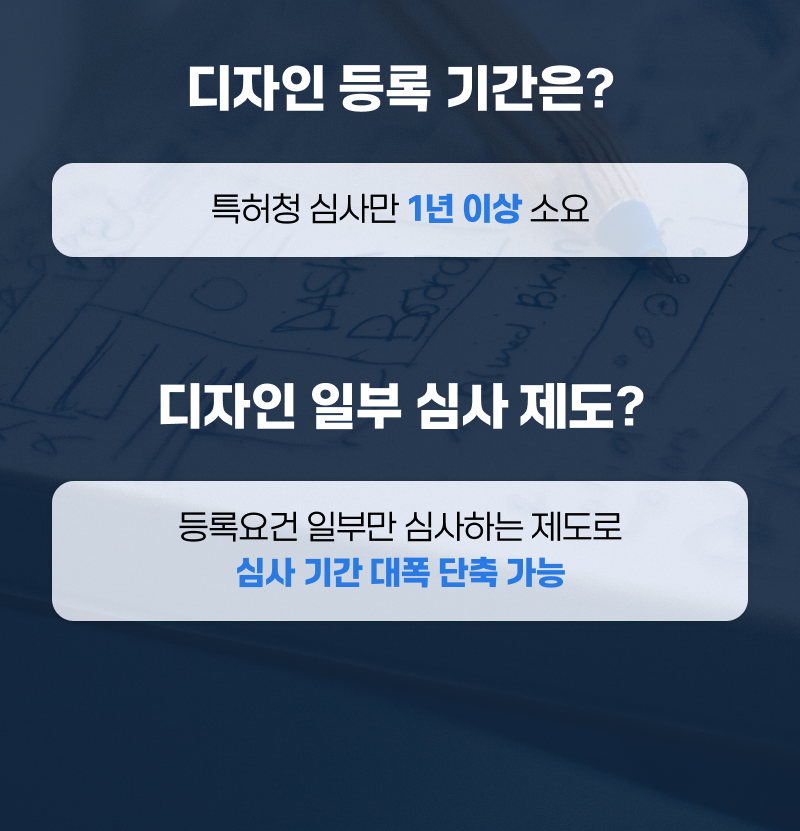 디자인등록은 출원 후 지식재산처(前 특허청) 심사에만 최소 1년~1년 5개월까지도 소요됩니다.
