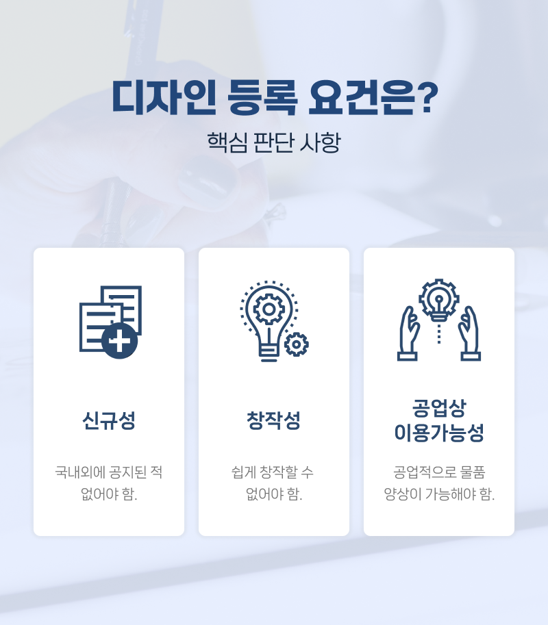 바로 이, 디자인의 성립요건을 충족시키는 것을 전제로 공업상 이용가능성, 신규성, 창작성을 만족해야 비로소 디자인등록을 받을 수 있습니다.