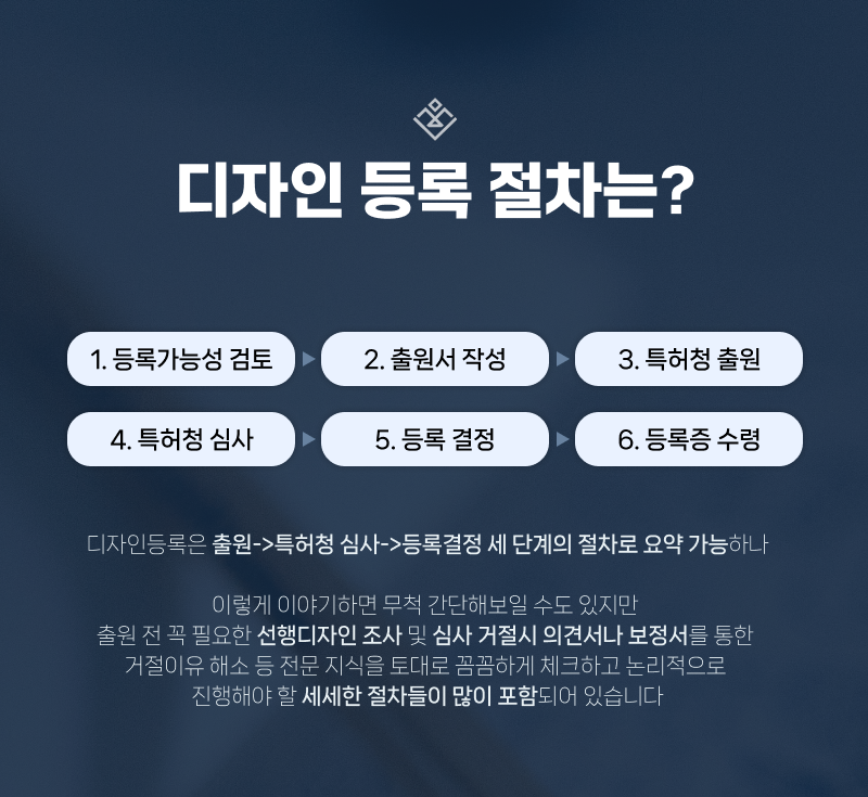 이렇게 이야기하면 무척 간단해보일 수도 있지만 출원 전 꼭 필요한 선행디자인 조사 및 심사 거절시 의견서나 보정서를 통한 거절이유 해소 등 전문 지식을 토대로 꼼꼼하게 체크하고 논리적으로 진행해야 할 세세한 절차들이 많이 포함되어 있습니다.