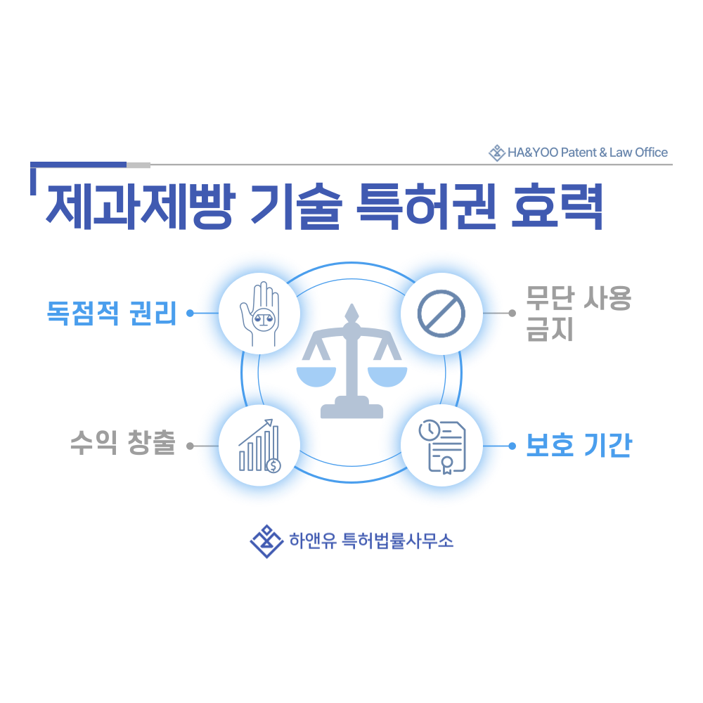예를 들어 케익의 촉촉함을 오래 유지하는 공정이나 과자의 바삭함을 높이는 가공 방법을 권리자가 단독으로 활용할 수 있습니다.