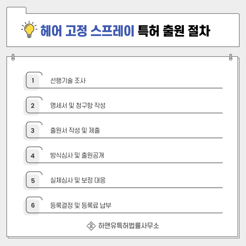 4. 헤어 고정 스프레이, 마이크로미스트, 안티휴미디티, 프리즈컨트롤, 논스티키, UV 프로텍션, 비건 스프레이 특허 출원 및 등록 절차