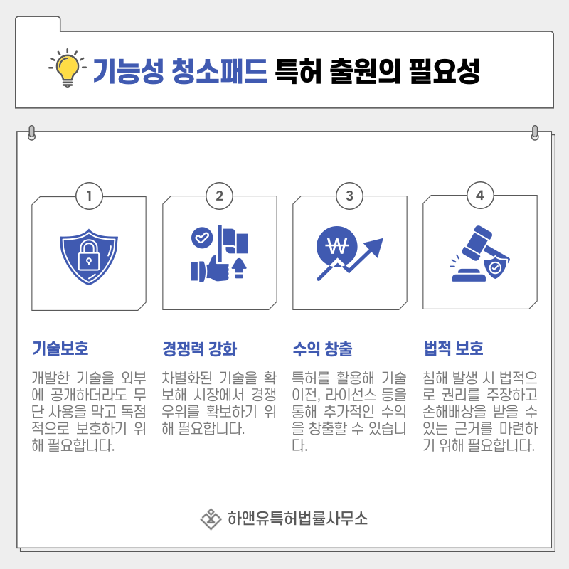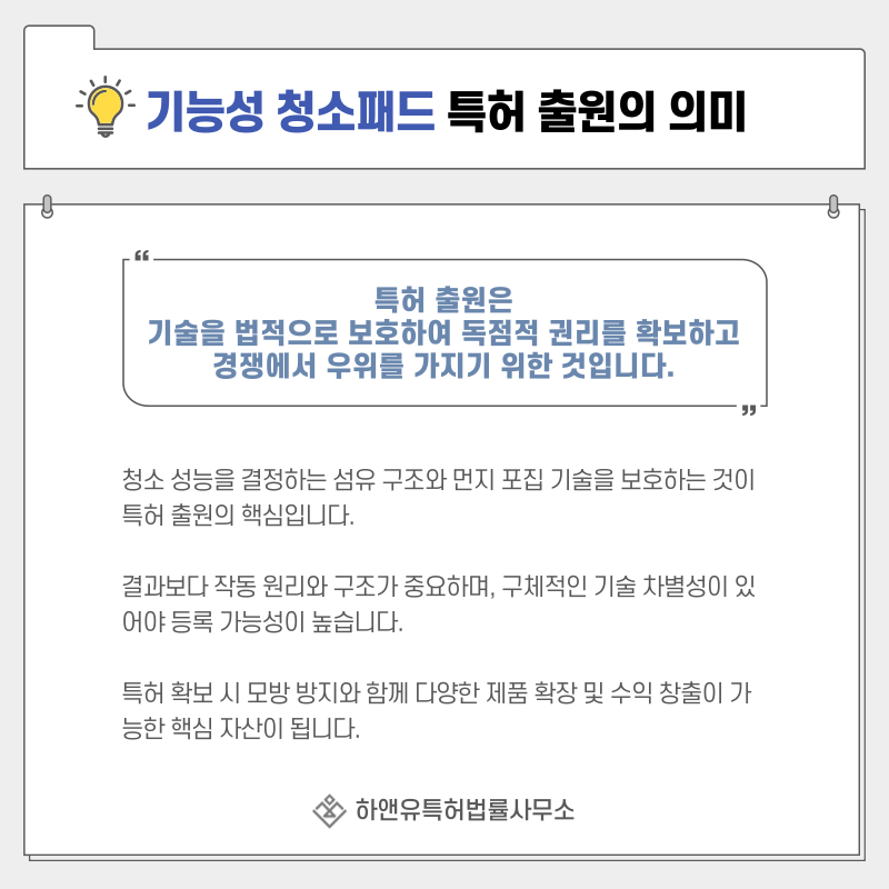 섬유의 미세 구조, 먼지 흡착 방식, 패드의 재사용 구조 등 실제 성능을 좌우하는 기술 요소가 핵심 보호 대상이 됩니다.