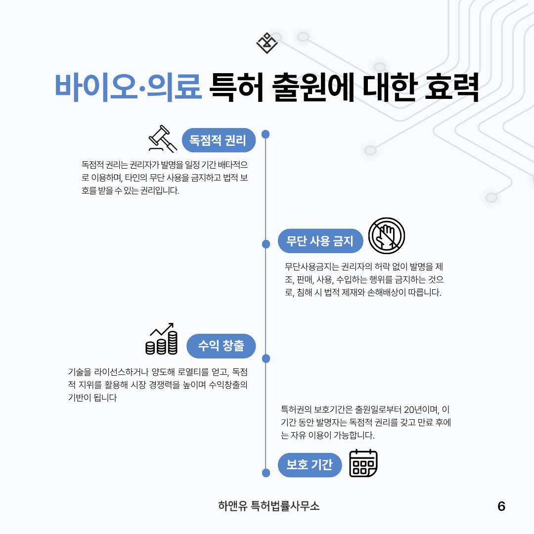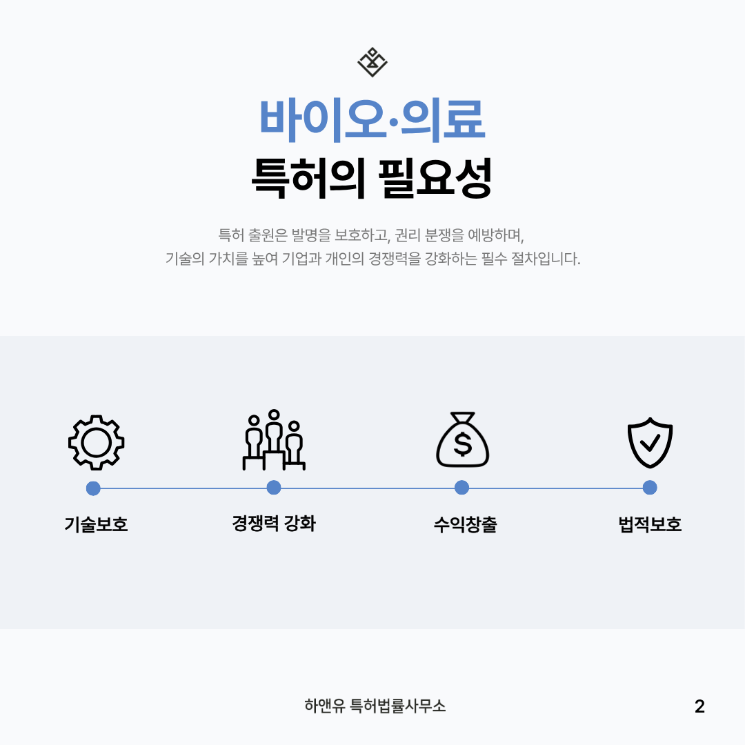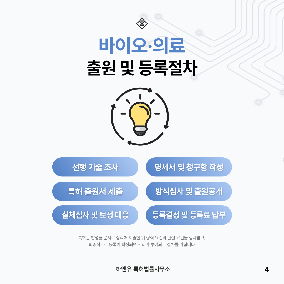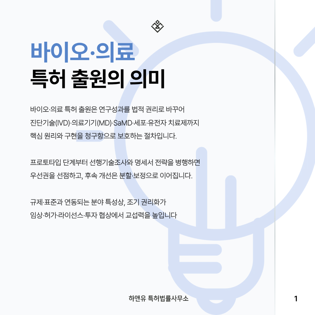 이때 바이오·의료 특허 출원은 연구개발과 병행되는 사업화 안전망입니다.