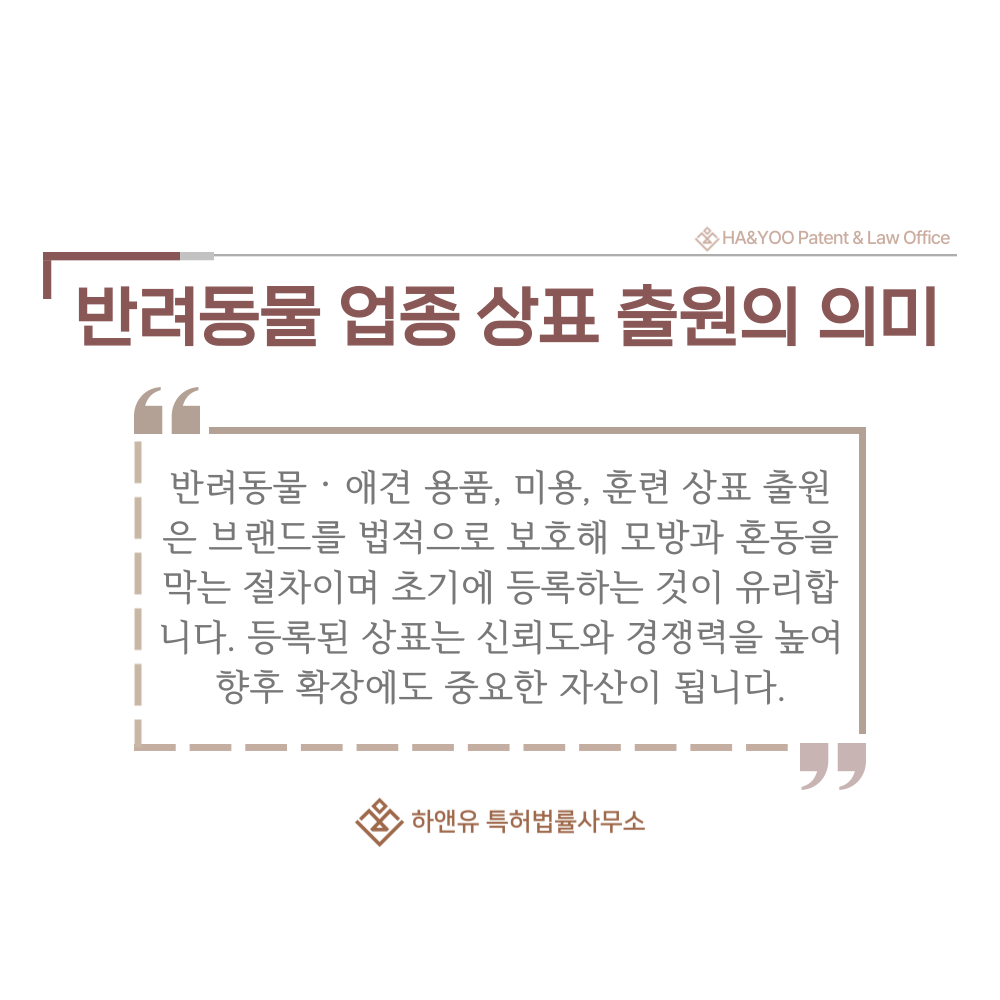 특히 반려동물 산업은 성장 속도가 빨라 상표권 보유 여부가 사업 신뢰도와 확장 가능성을 판단하는 기준이 되기도 합니다.