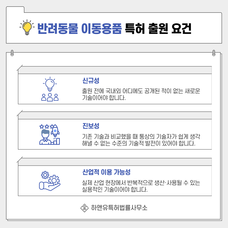 3. 반려동물, 펫, 강아지, 고양이, 이동가방, 슬링백, 카시트, 유모차, 백팩 특허 출원 및 등록 요건