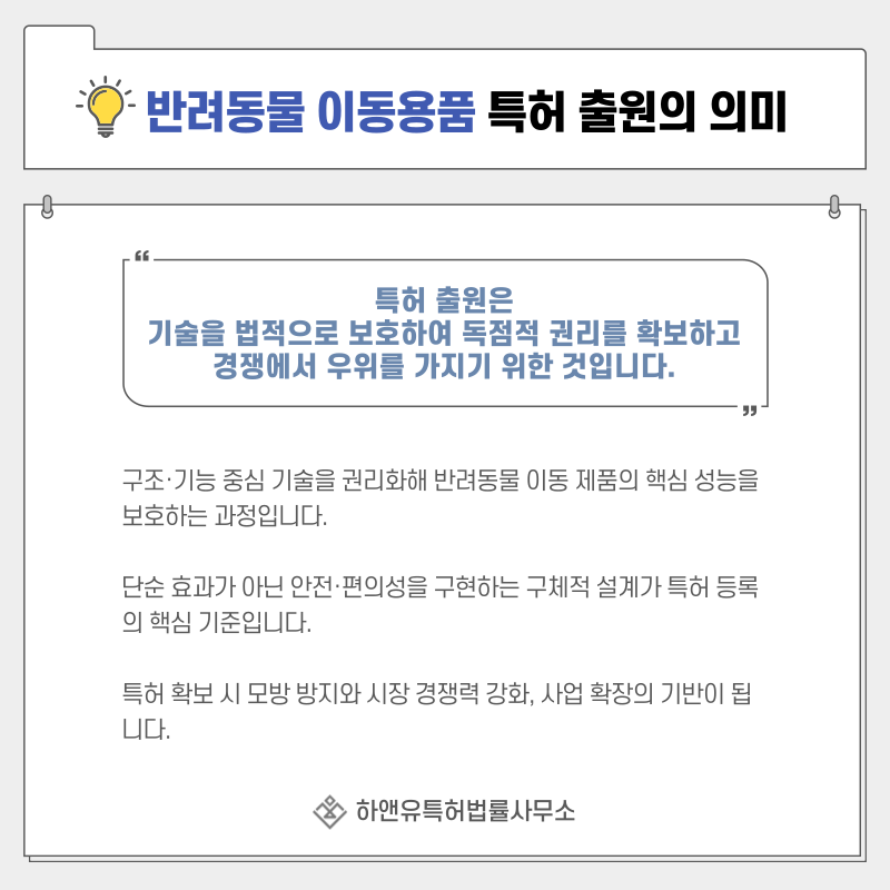 하중 분산 설계, 반려동물 고정 구조, 통풍 및 위생 기능, 이동 시 흔들림 방지 구조 등은 쉽게 모방될 수 있는 핵심 기술입니다.