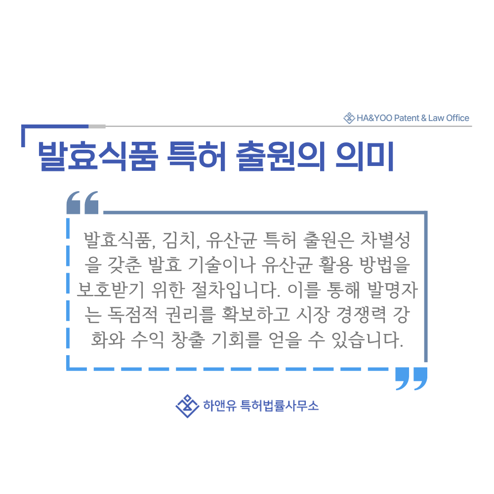 따라서 발효식품, 김치, 유산균 분야에서 특허 출원은 필수적인 법적 안전망이 됩니다.