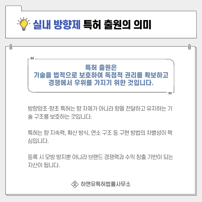 특히 홈프래그런스 시장처럼 유사 제품이 빠르게 등장하는 분야에서는 매우 중요한 보호 수단입니다.