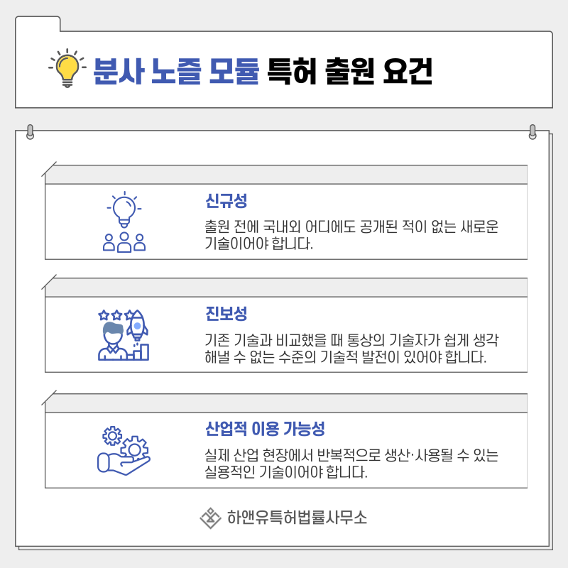 노즐 형상, 분사 압력 조절 방식, 입자 크기 제어 기술, 막힘 방지 구조 등은 쉽게 모방될 수 있는 기술 요소이기 때문에 사전에 권리화가 필요합니다.
