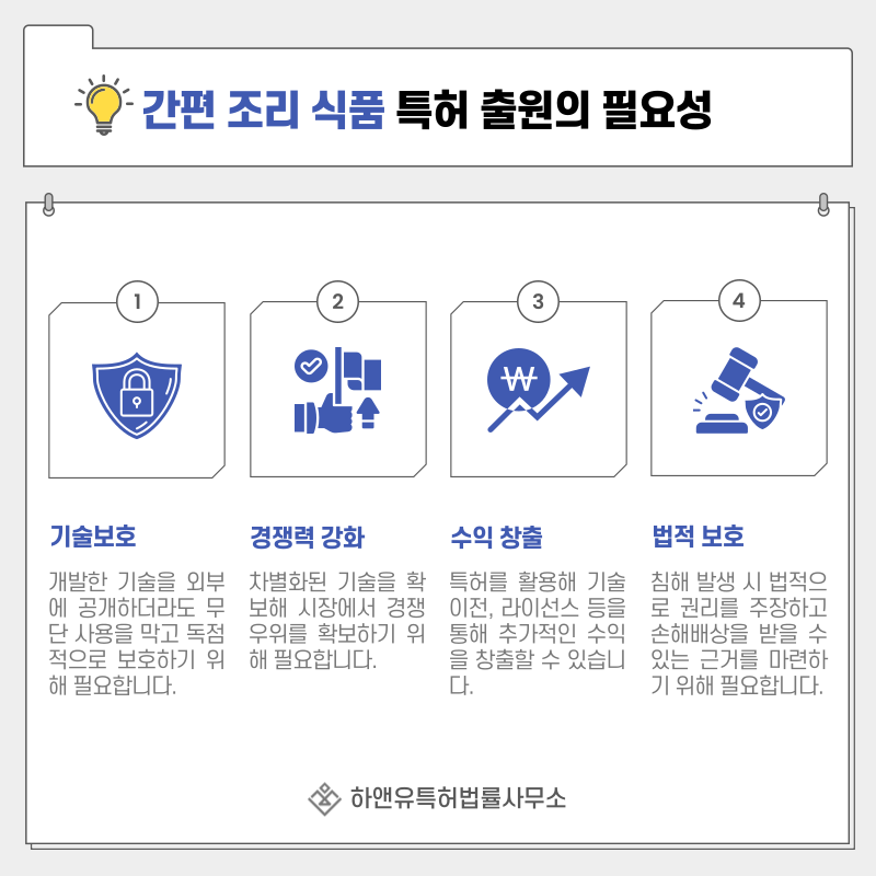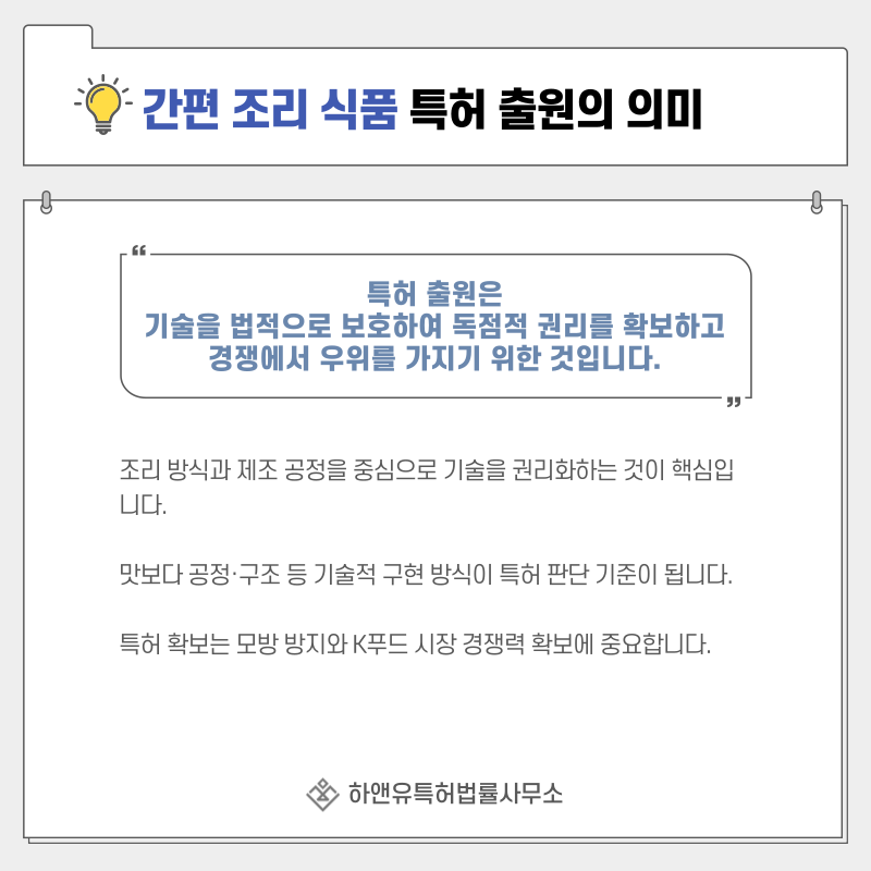 특히 K푸드와 간편식 시장은 성장 속도가 빠르기 때문에 초기 단계에서 특허 전략을 함께 준비하는 것이 중요합니다.
