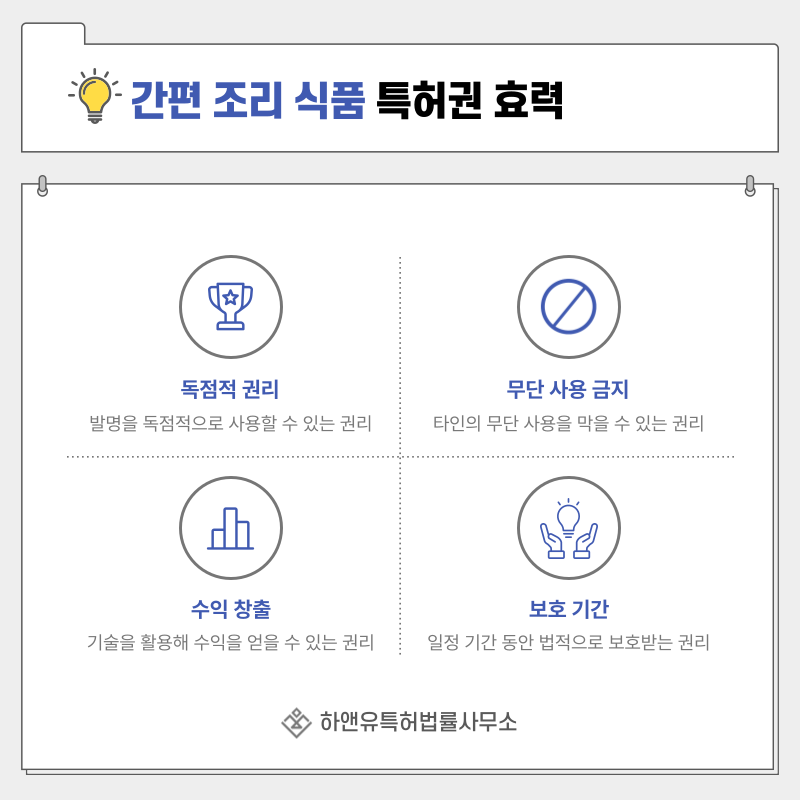 이는 동일한 제조 공정이나 조리 구조를 경쟁사가 임의로 사용할 수 없도록 하는 핵심 권리입니다.