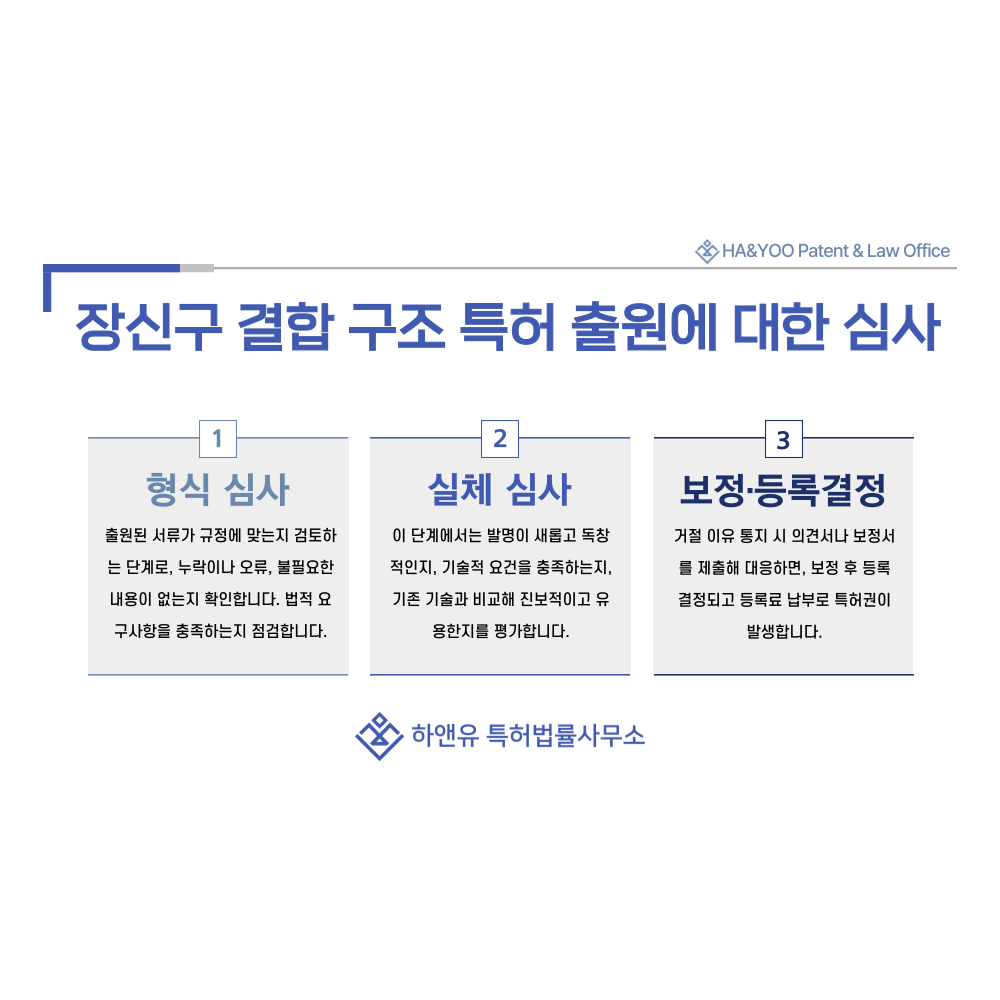 이 단계에서는 발명이 특허 요건인 신규성, 진보성, 산업적 이용가능성을 충족하는지를 판단합니다.