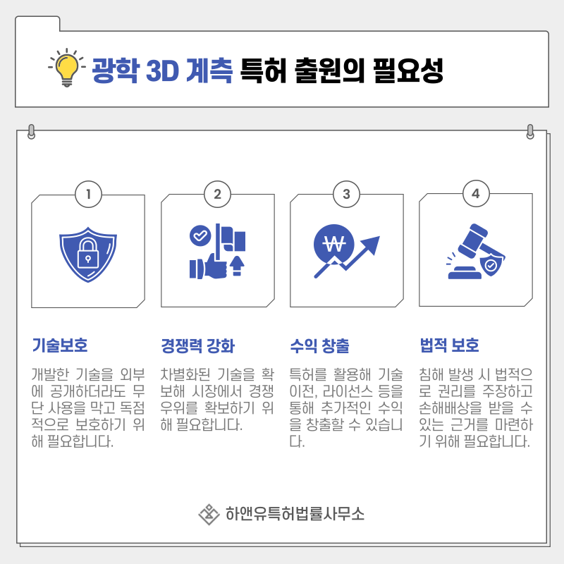 특허를 통해 광원 투사 방식, 거리 계산 알고리즘, 이미지 정합 기술 등 구체적인 기술 구성을 권리로 보호할 수 있습니다.
