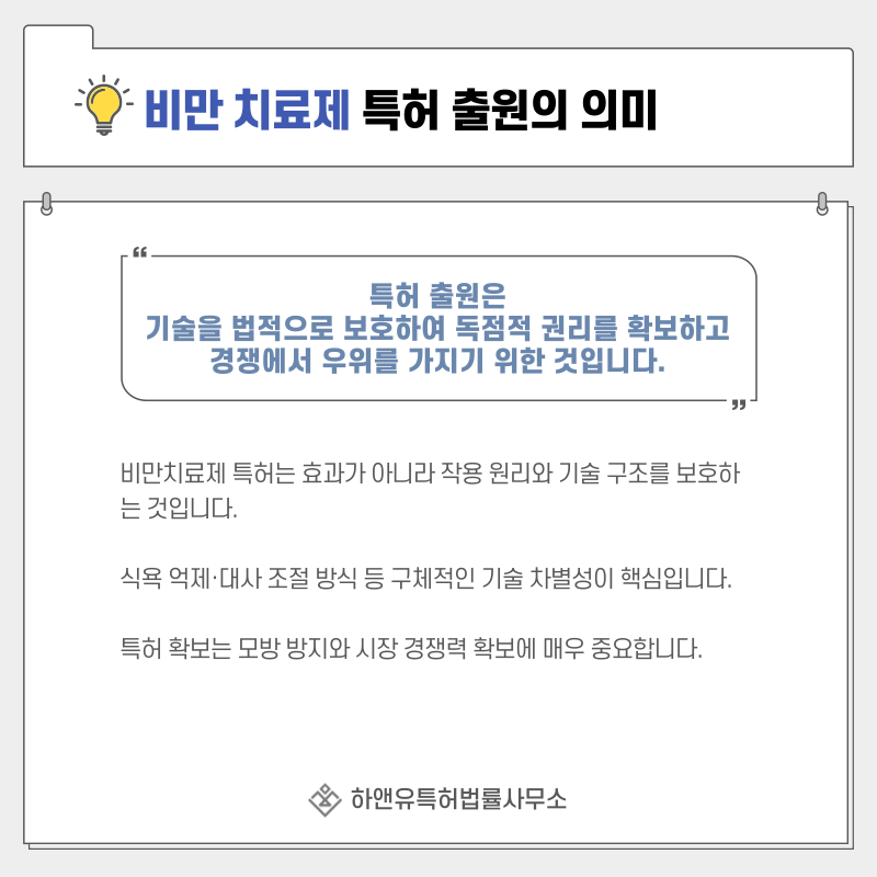 특허를 통해 유효성분 구조, 지속형 방출 기술, 식욕 조절 메커니즘 등을 보호할 수 있습니다.