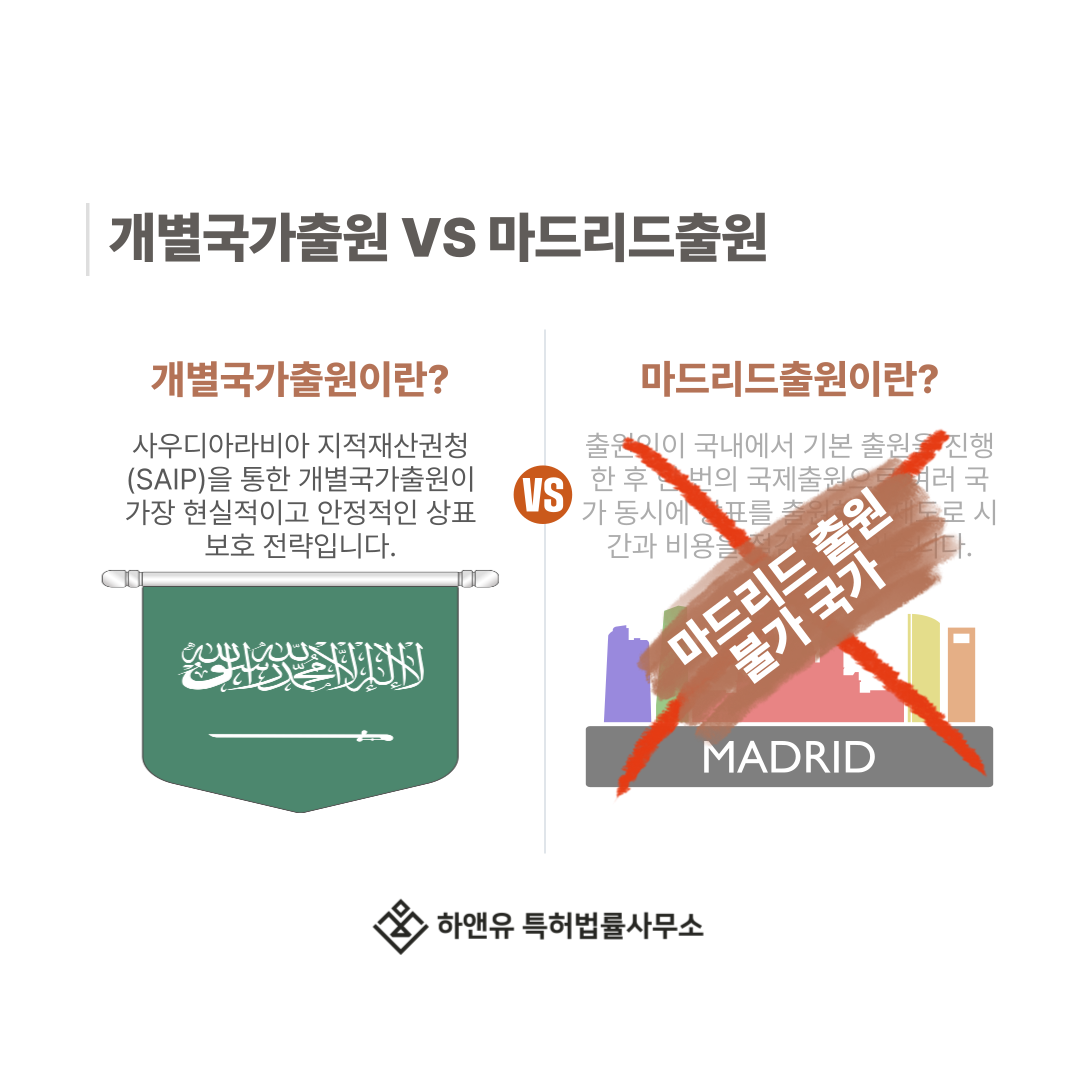 사우디아라비아는 마드리드 국제출원(Madrid System)에 가입되지 않은 국가이기 때문에, 다른 국가와 달리 국제출원 절차를 활용할 수 없습니다.