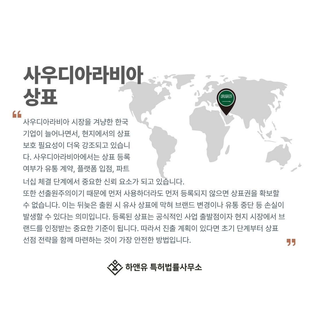 사우디아라비아 시장을 겨냥한 한국 기업이 늘어나면서, 현지에서의 상표 보호 필요성이 더욱 강조되고 있습니다.
