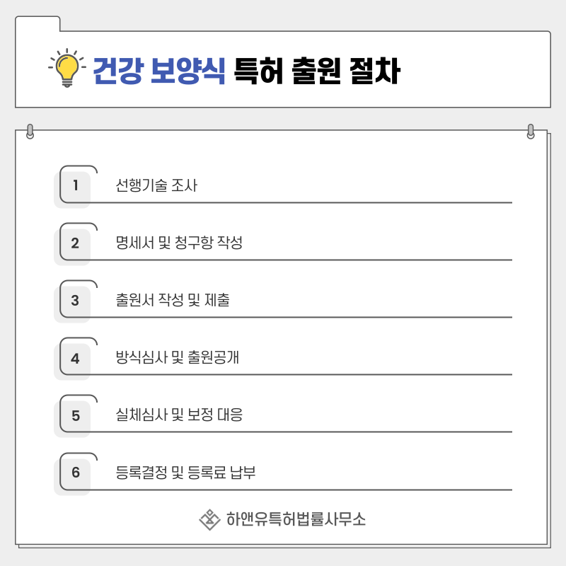 따라서 출원 전 선행기술 조사를 통해 기존 레시피, 제조 공정, 식품 조성물과의 차이를 명확히 확인해야 합니다.