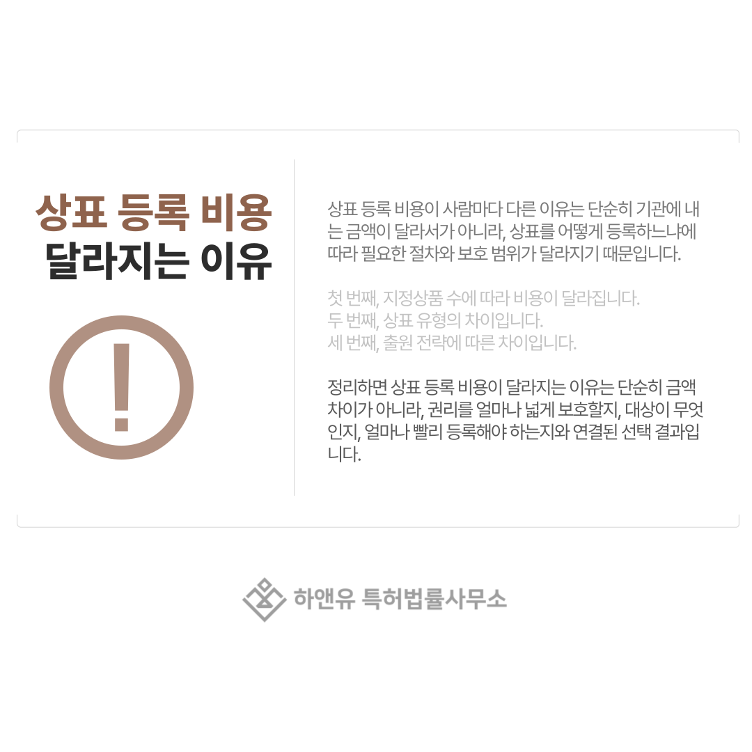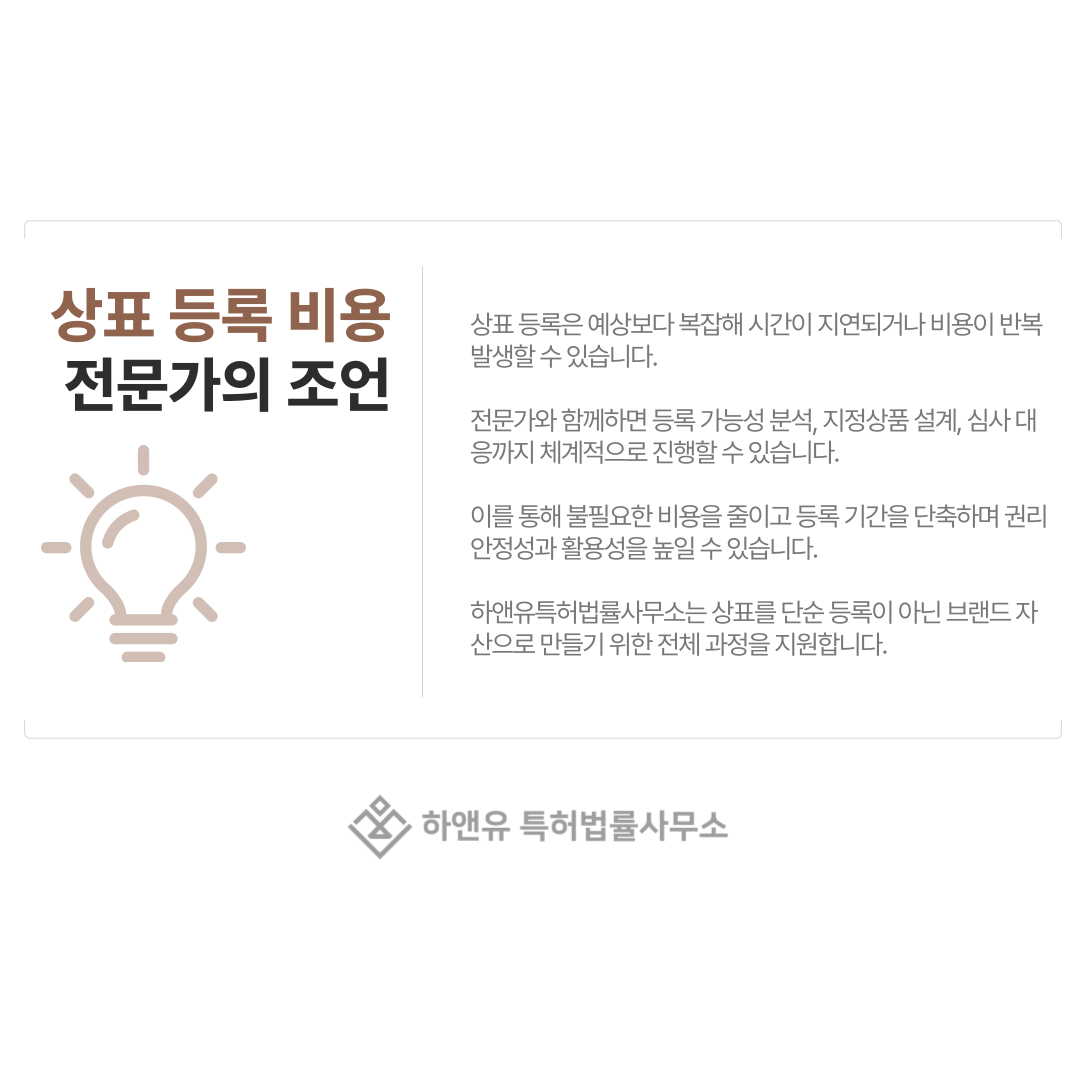 #상표등록비용 #상표권등록비용 #브랜드보호 #지식재산권 #비용안내 #사업준비 #상표 #상표권 #상표출원 #상표등록 #TrademarkRegistration #TrademarkApplication #특허사무소 #특허법률사무소 #하앤유특허법률사무소
