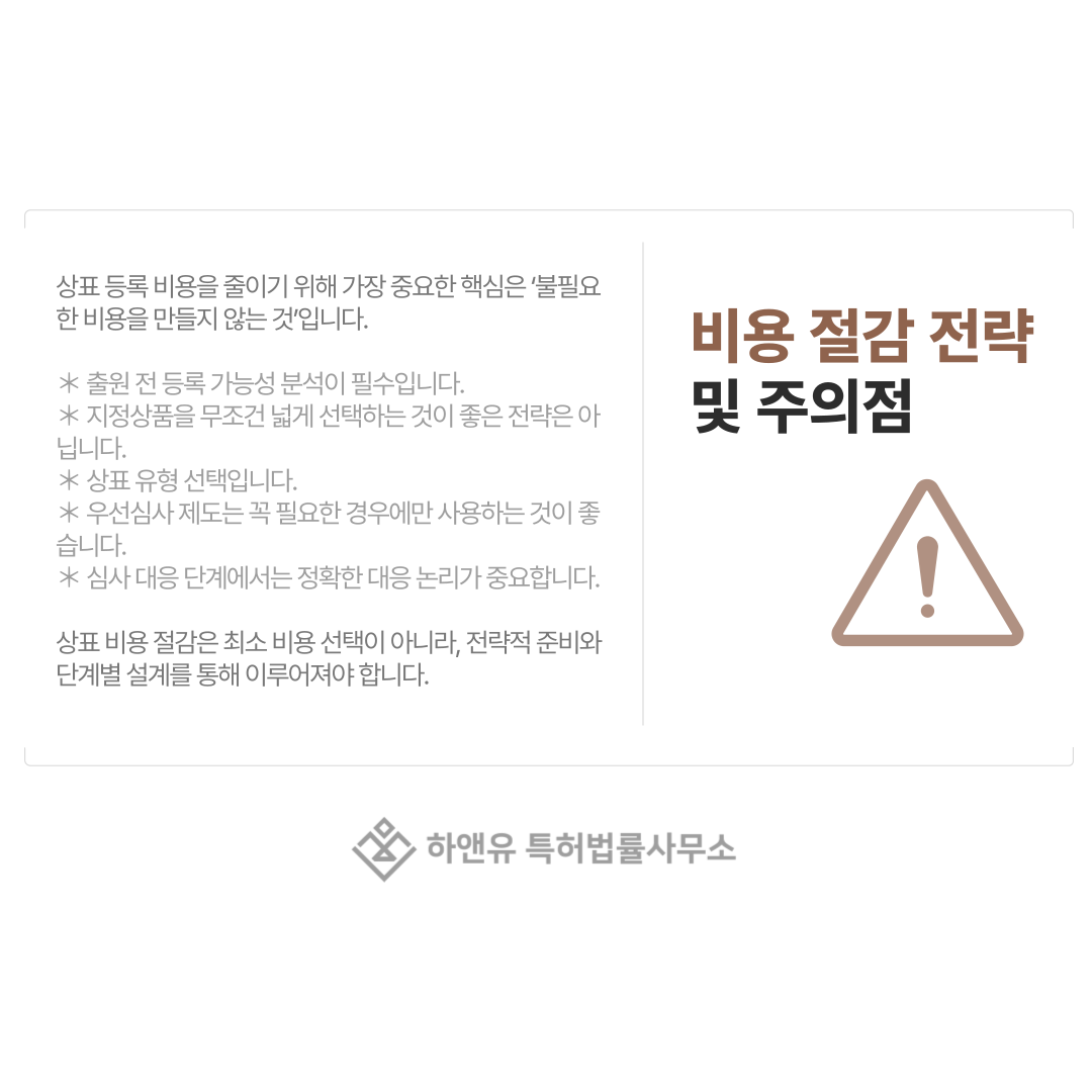 그래서 비용을 줄이는 가장 효과적인 방법은 무조건 최소 비용을 선택하는 것이 아니라, 처음부터 사업 구조에 맞춘 상표 전략을 세우는 것입니다.
