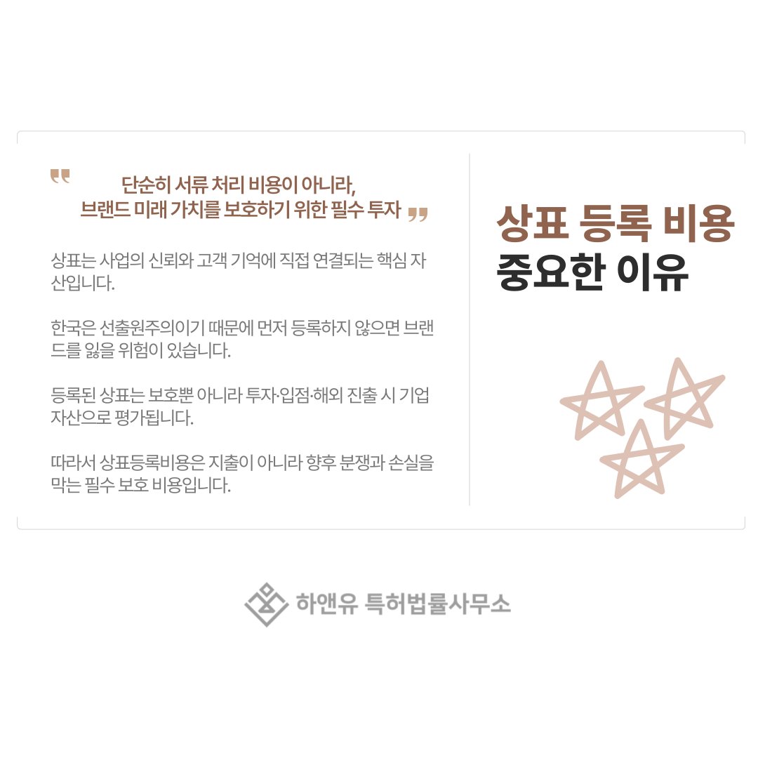 따라서 상표 등록 비용은 지금 발생하는 지출이 아니라, 앞으로 발생할 수 있는 브랜드 분쟁 비용과 리스크를 예방하는 보호 비용입니다.