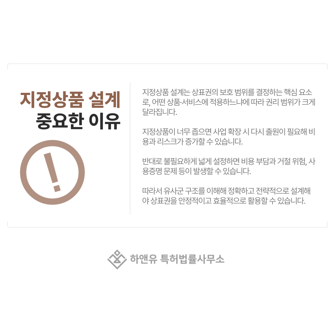 즉, 지정상품을 어떻게 설정하느냐에 따라 상표권의 실제 보호 범위가 넓어지기도 하고, 반대로 매우 제한적이 될 수도 있습니다.