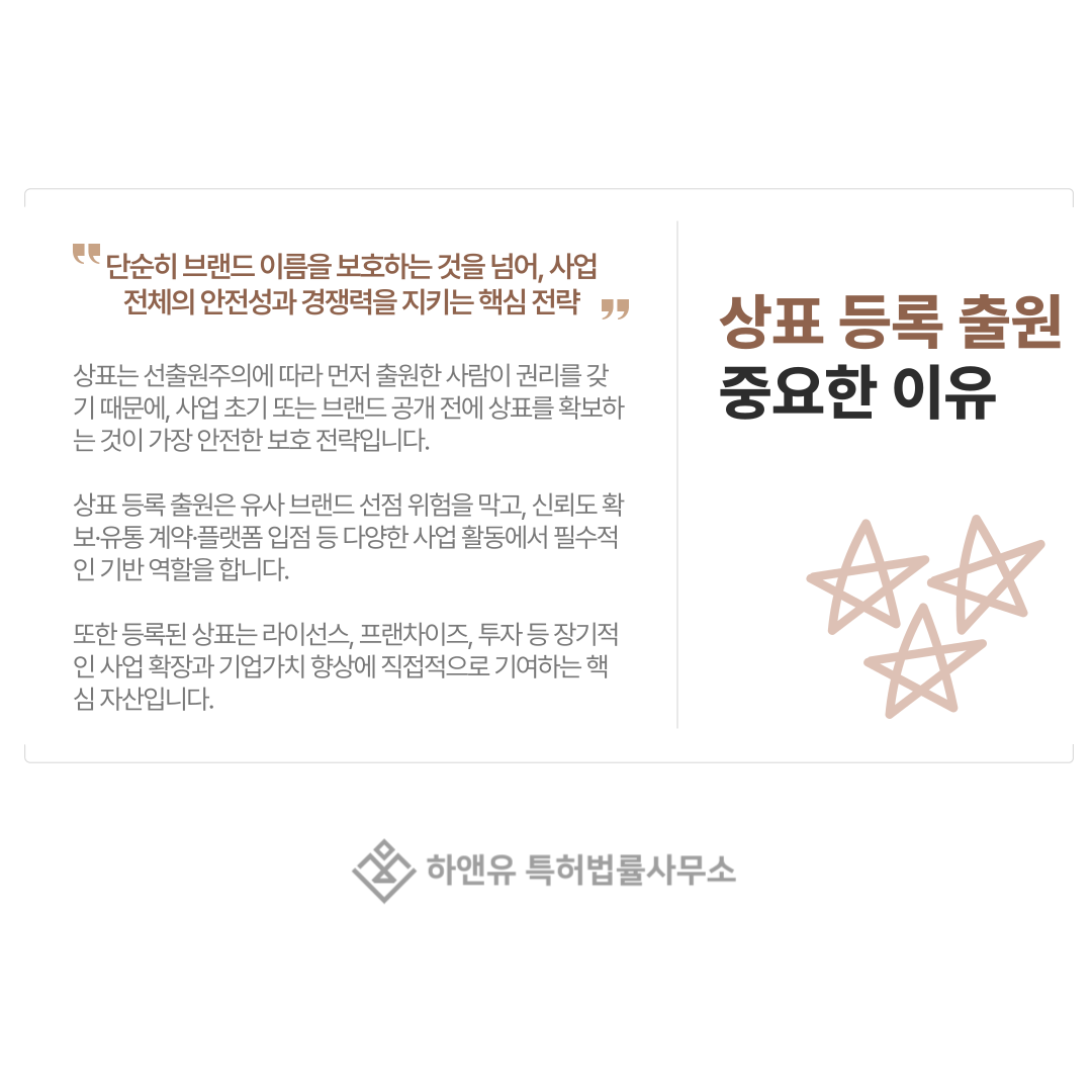 이처럼 상표 등록 출원은 위험을 줄이고 브랜드를 안정적으로 보호하는 기본이 되는 과정입니다.
