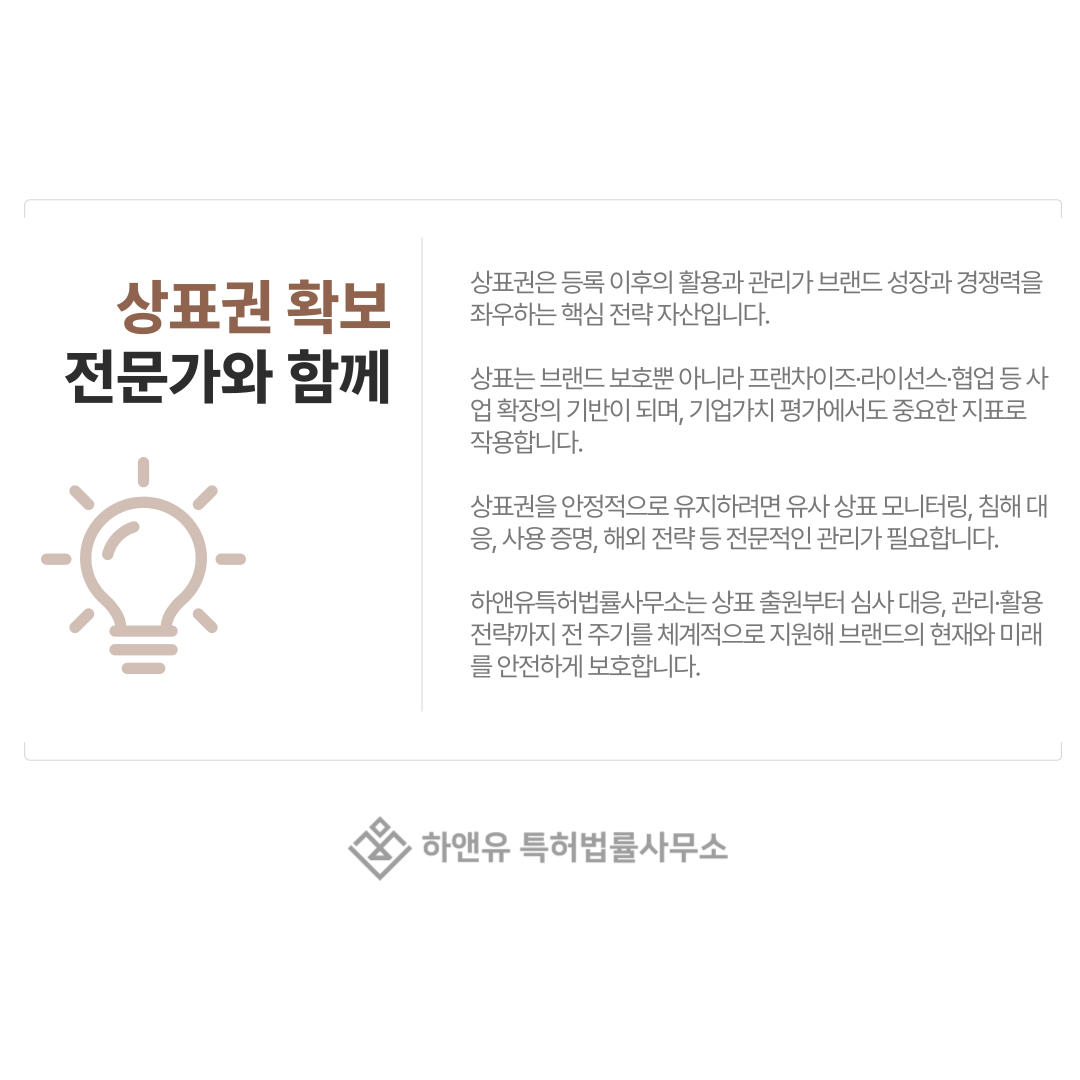 이처럼 상표권은 보호·확장·가치 평가까지 연결되는 전략적 자산이기 때문에, 관리 과정에서도 전문가의 조력이 필요합니다.