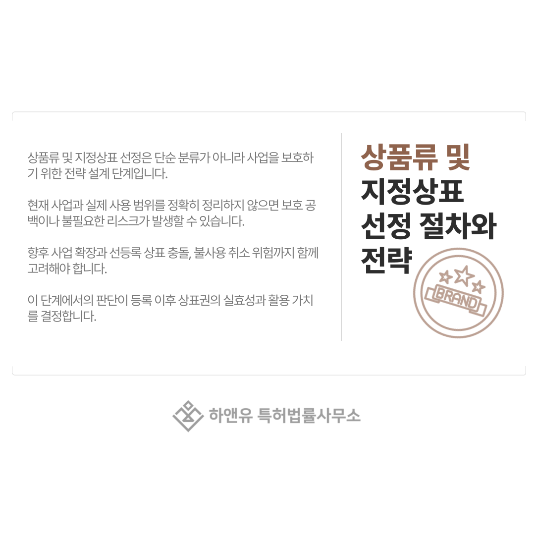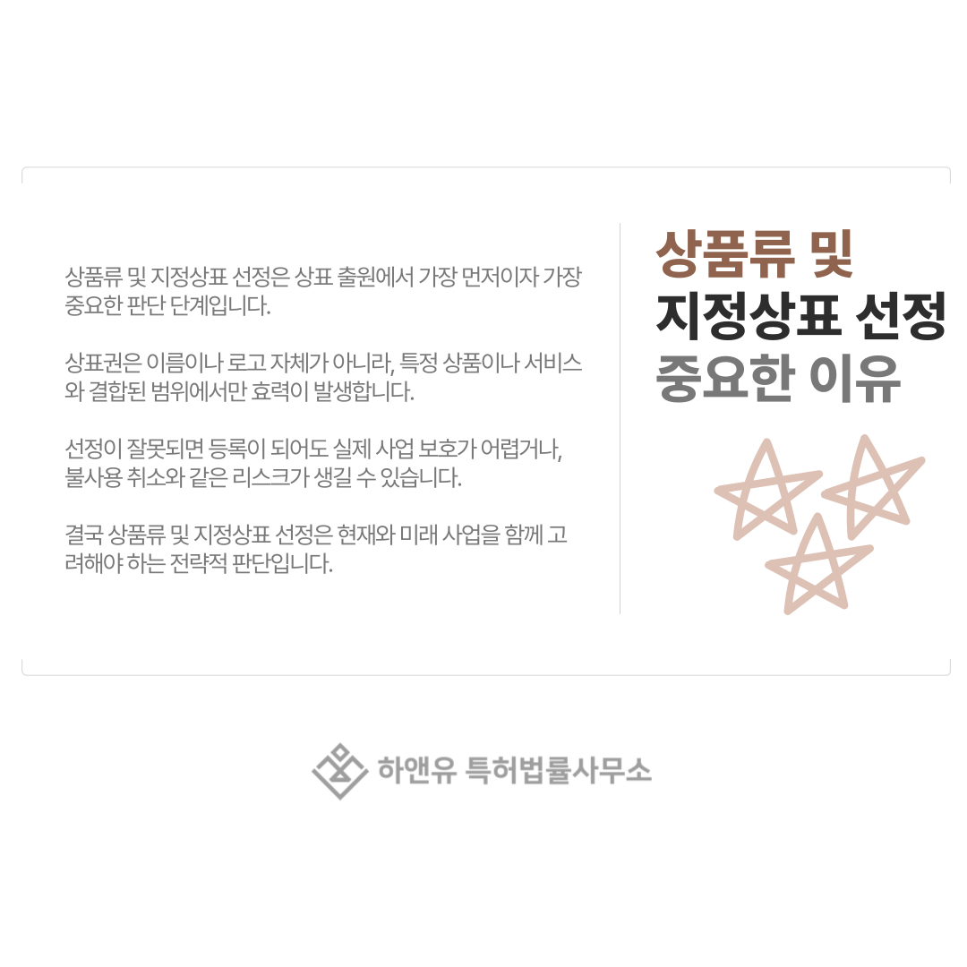 #상품류및지정상표선정 #지정상품 #상품류선택 #상표권보호 #상표출원전략 #상표 #상표권 #상표출원 #상표등록 #TrademarkRegistration #TrademarkApplication #특허사무소 #특허법률사무소 #하앤유특허법률사무소