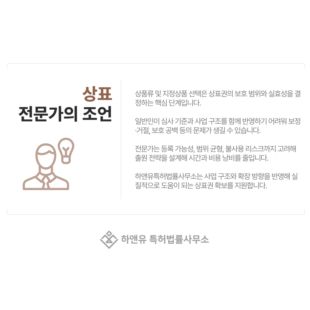 이 구조를 정확히 이해하지 못하면 상표는 등록되었지만 활용 범위가 제한되는 상황이 발생할 수 있습니다.