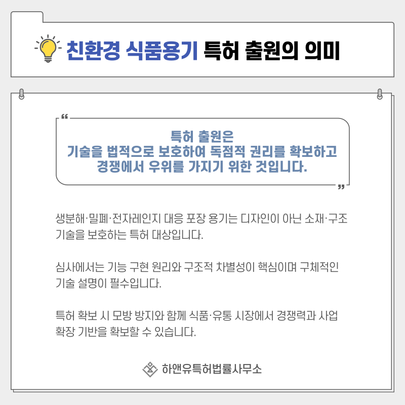 특히 친환경 포장 시장은 유사 제품이 빠르게 등장하기 때문에 사전 권리 확보가 중요합니다.