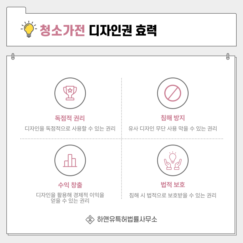 특히 청소가전처럼 디자인이 구매 요소로 작용하는 제품은 독점적 권리의 가치가 더욱 큽니다.