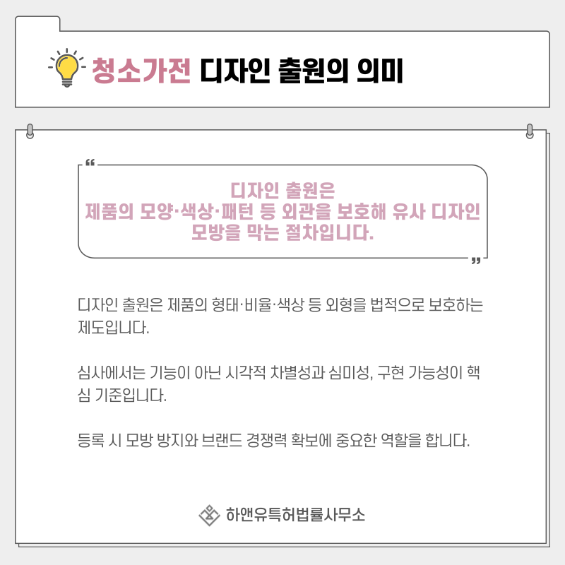 특히 청소가전처럼 구조와 외형이 결합된 제품은 디자인 권리 확보 여부에 따라 시장 대응력이 크게 달라집니다.