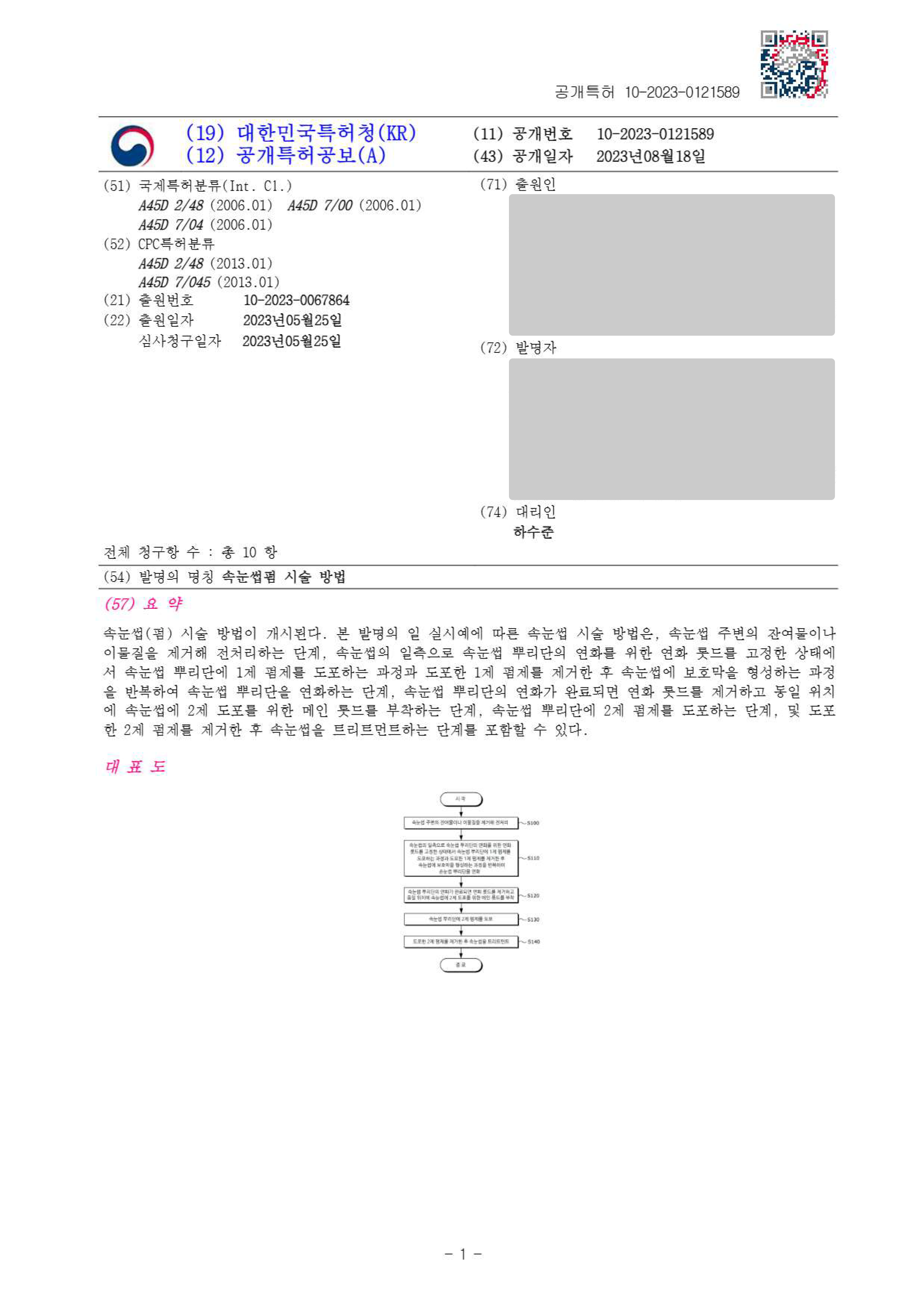 하앤유특허법률사무소를 통해 출원 등록된 미용 기술·시술 특허 등록사례입니다.