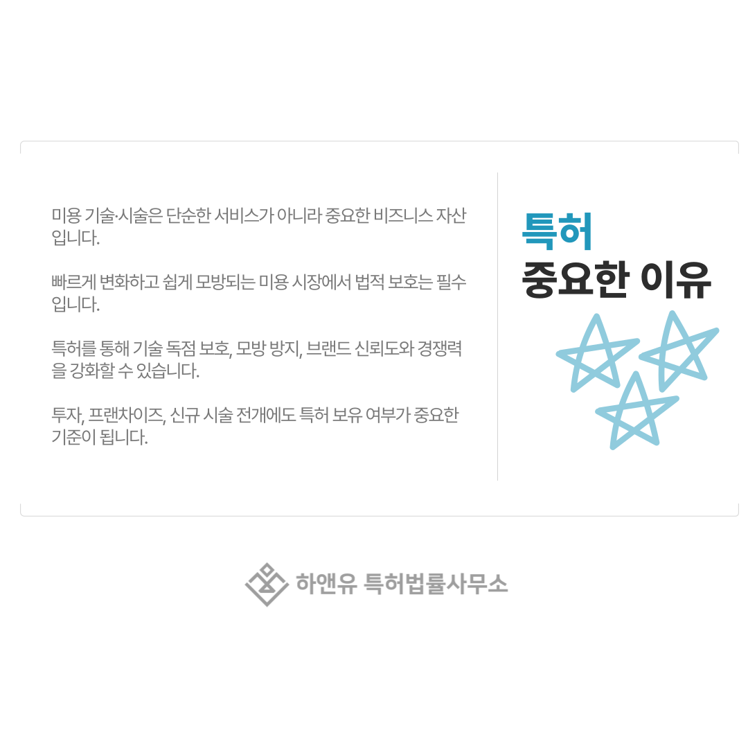 또한 투자 유치, 프랜차이즈 확장, 새로운 시술 론칭 시에도 특허 보유 여부는 중요한 판단 기준이 됩니다.