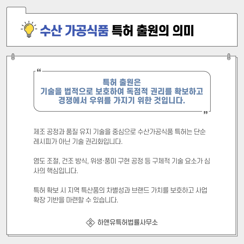 수산가공식품, 염장·건조 수산물, 지역특산 가공식품의 특허 출원은 단순한 레시피 보호가 아니라