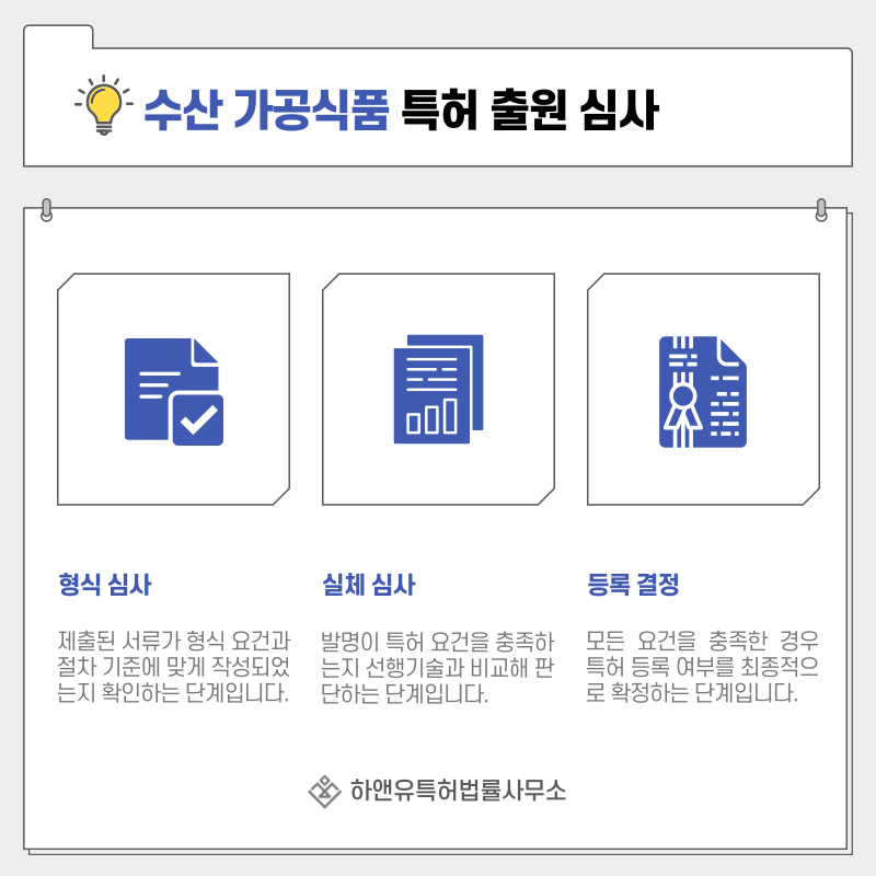 수산가공식품과 염장·건조 수산물, 지역특산 가공식품의 특허 출원은 먼저 형식심사를 통해 기본 요건을 확인받게 됩니다.