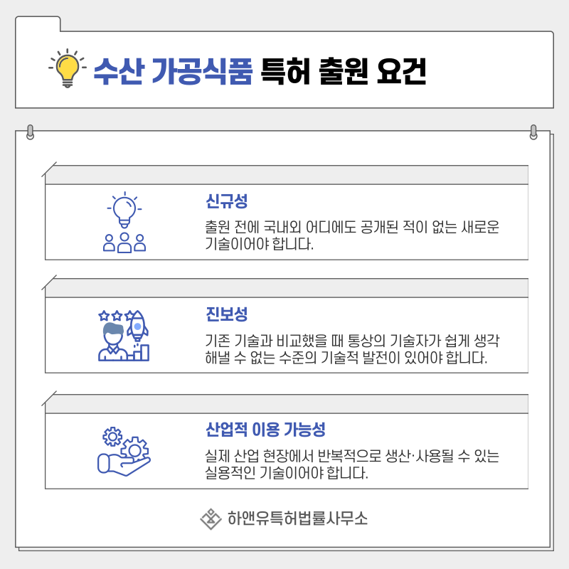 수산가공 기술의 경우 신규성, 진보성, 산업적 이용가능성이 주요 판단 기준이 됩니다.