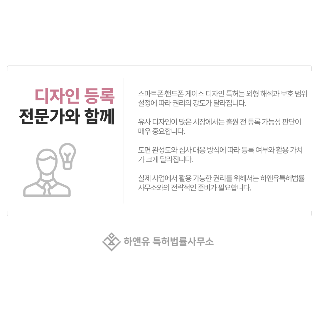 하앤유특허법률사무소는 스마트폰·핸드폰 케이스 디자인 특허의 특성과 시장 구조를 정확히 이해하고 있습니다.