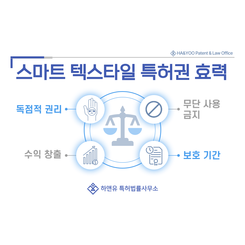 특허 등록이 완료되면 스마트 텍스타일 기술에 대해 출원인은 일정 기간 동안 독점적으로 제조, 사용, 양도, 수입 등을 할 수 있는 배타적 권리를 가집니다.