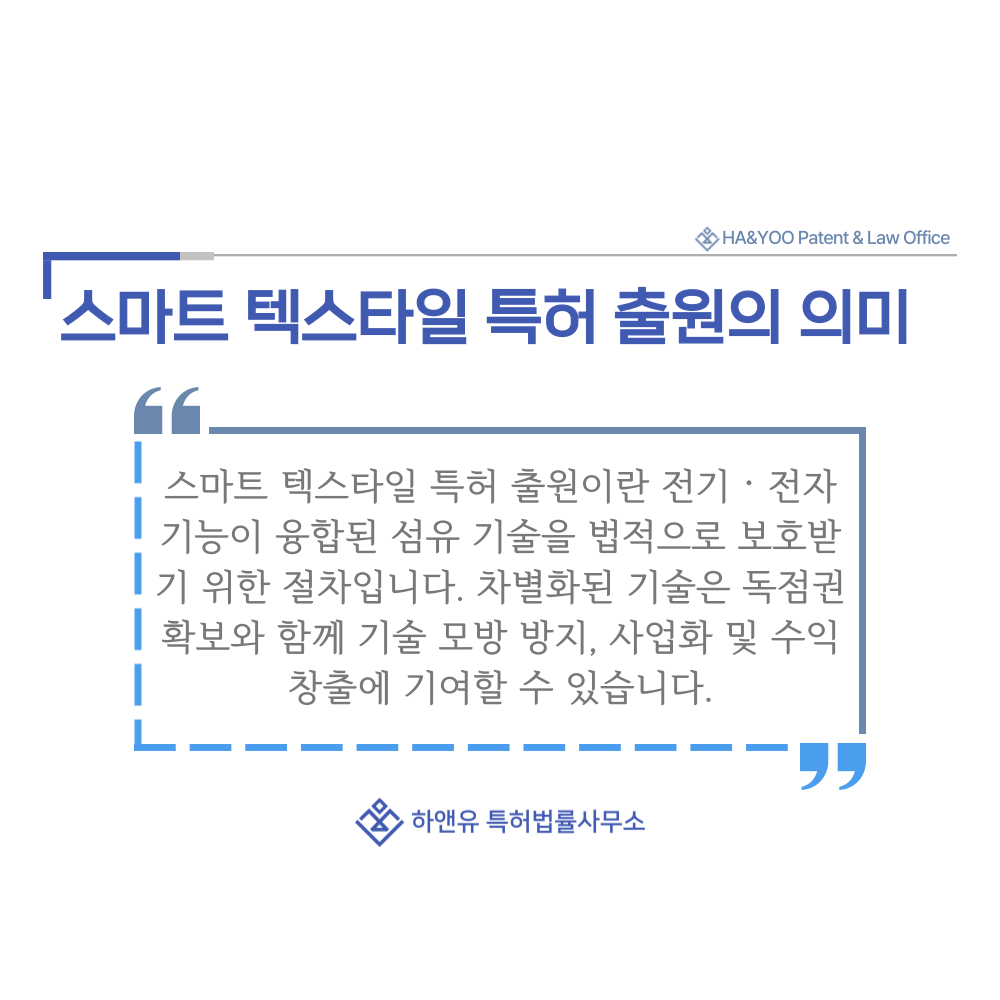스마트 텍스타일은 센서, 전도성 섬유, 반응형 소재 등 복합기술이 포함되므로, 이를 특허로 등록하면 핵심 기술이 외부에 노출되더라도 법적으로 보호받을 수 있어 모방이나 유출을 예방할 수 있습니다.