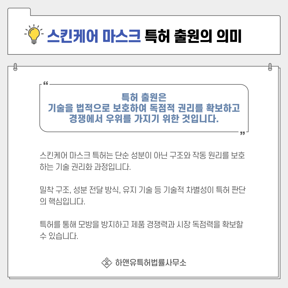 스킨케어 마스크 관련 특허 출원은 단순한 화장품 아이디어를 보호하는 것이 아니라 제품의 구조와 기술을 법적으로 권리화하는 과정입니다.