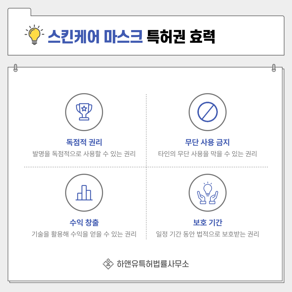 스킨케어 마스크 특허가 등록되면 해당 기술을 일정 기간 독점적으로 사용할 수 있는 권리가 부여됩니다.